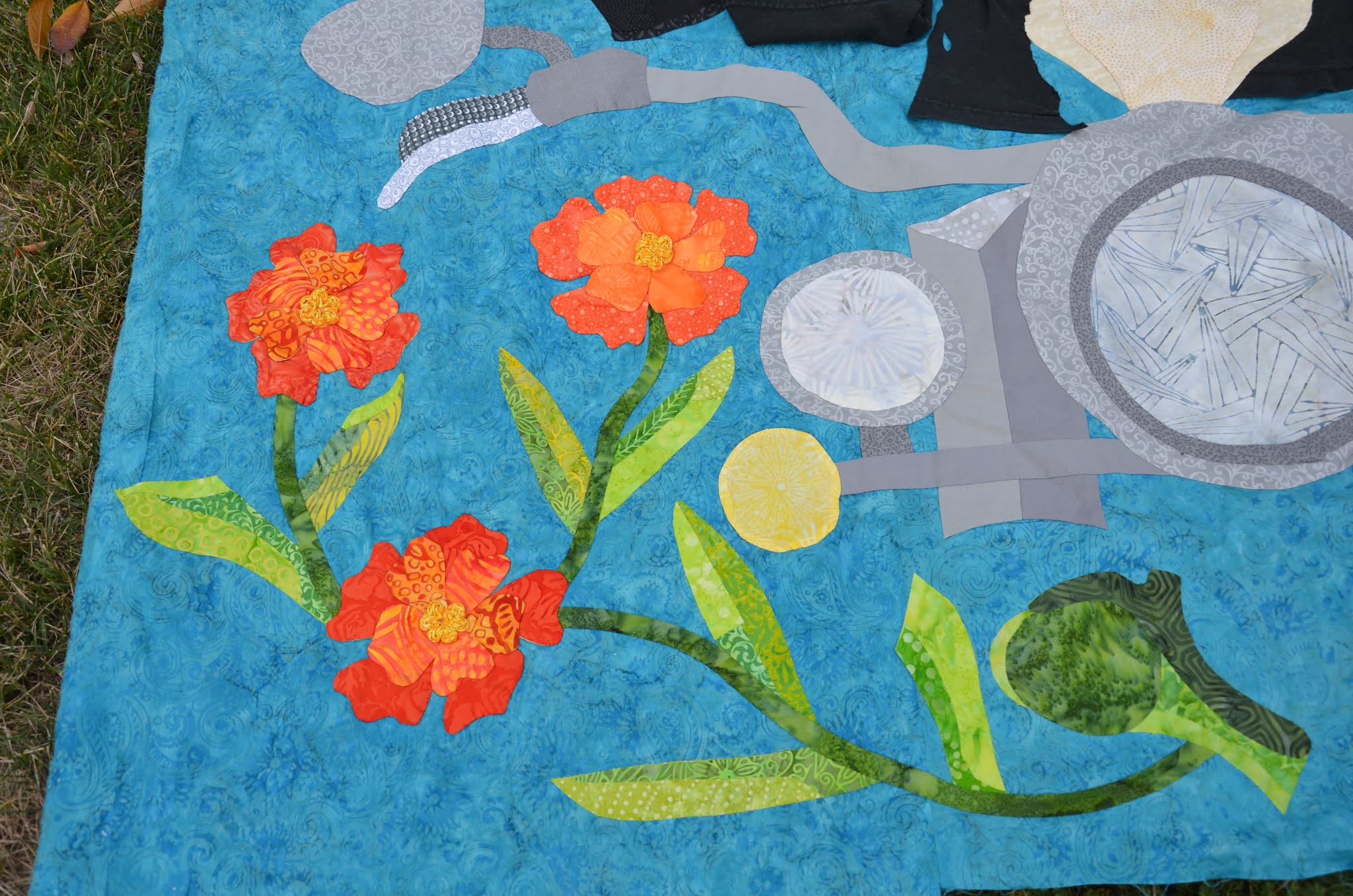 It is full of symbolic details. Traditional marigolds. The leaves are different styles of knife blades. Boomer collects knives. The funny shaped leaf is a pork chop. Because of that time on the motorcycle trip before he got hearing aids. I said I wanted to get to a location in time to get to the Quilt Shop. He looked confused and said "Pork Chops? You just ate. "